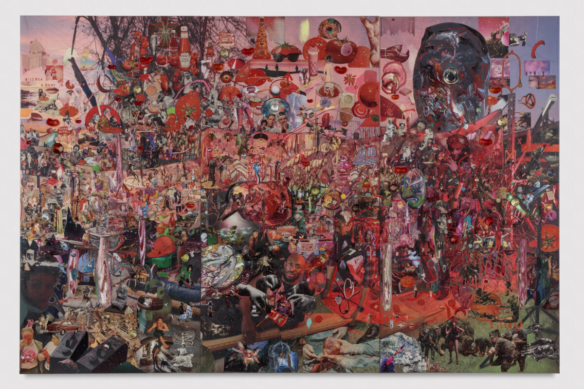 Known for his dense multimedia compositions that reference both art history and mythology, Hundley’s work weaves together scenes from the past with familiar imagery taken from the contemporary world. Working in a variety of media Hundley fuses painting, drawing, sculpture, collage, photography, and performance into rich, multifaceted tableaux. Through a process ranging from gradual accumulation to spontaneous mark making, he builds up the surface of his works using quotidian found materials. Individual additions of embroidery, thread, straight pins, ephemera, magazine cut-outs, photographs, and paint come together to form complex compositions that at first glance appear unified but on closer inspection reveal their intricate and dexterously crafted components.