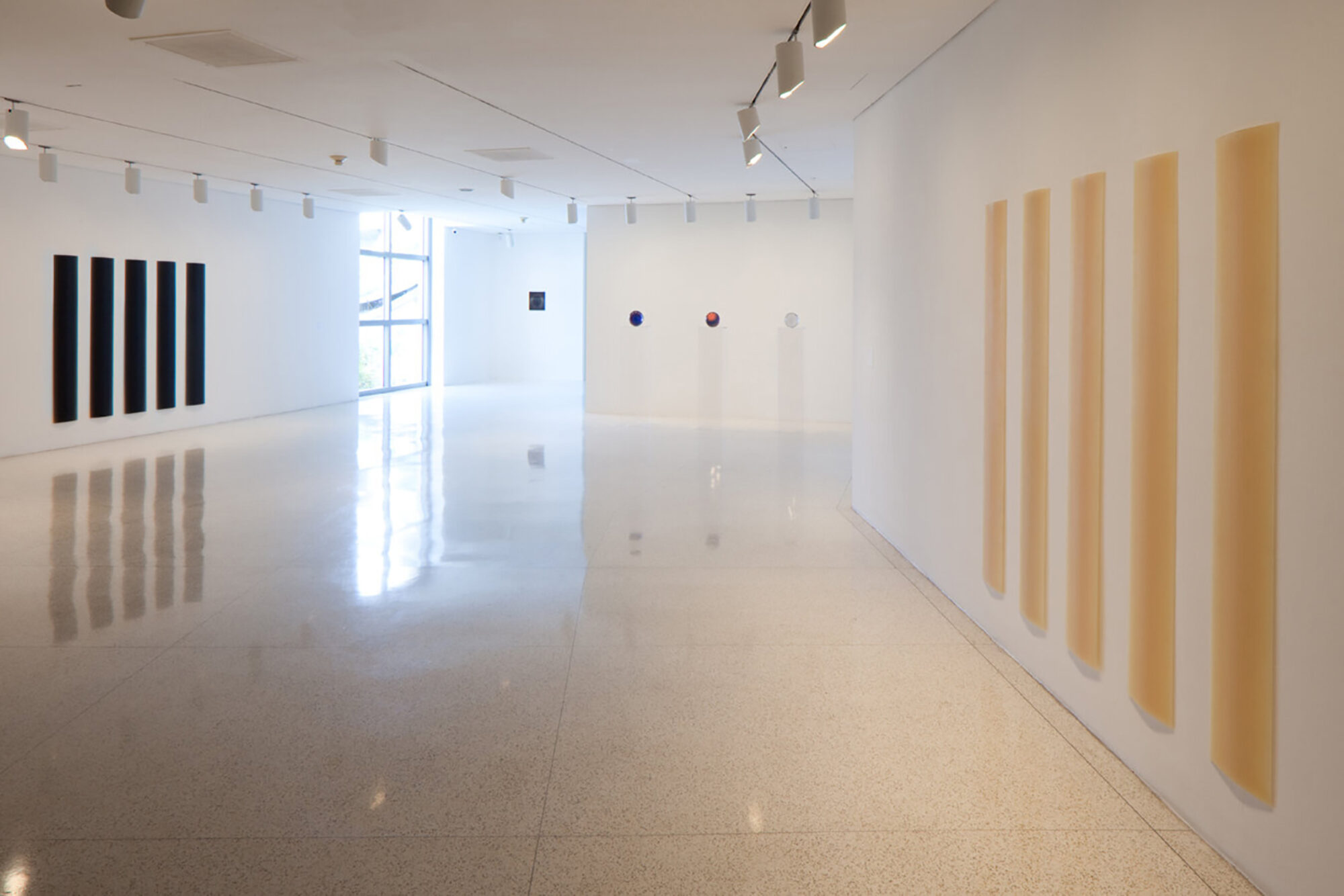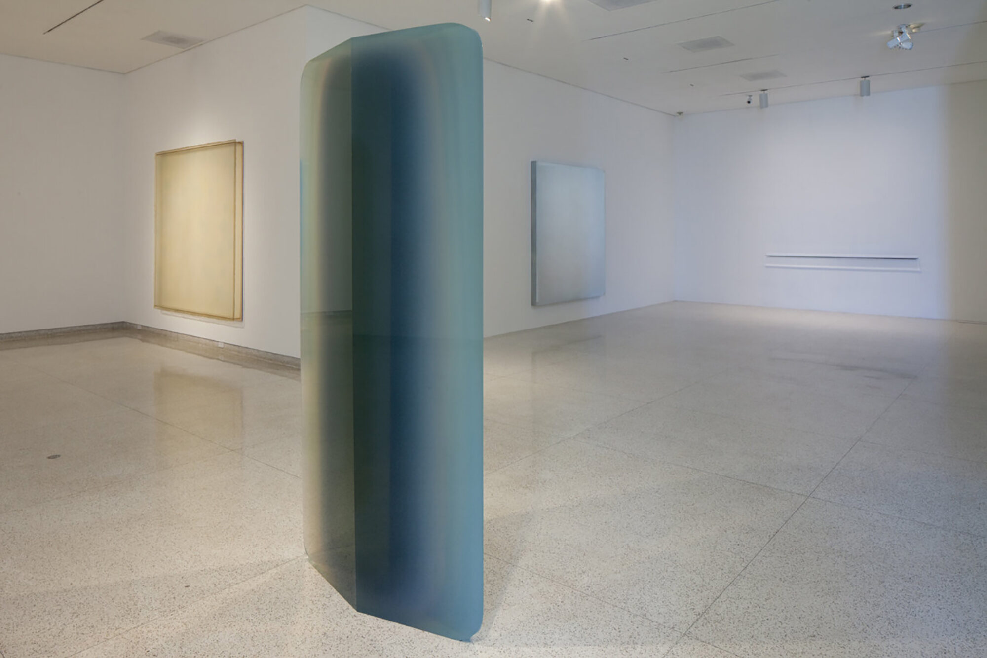 In addition to artworks which literally claim the entire space of the room, the exhibition also features a number of sculptures and paintings that function as prisms or mirrors to activate the space surrounding them. The properties of glass are explored in Larry Bell’s coated glass cubes and in monochromatic paintings by Mary Corse which are embedded with tiny glass microbeads. Elsewhere in the exhibition, the variously luminous and prismatic effects of cast or vacuum-formed resins and plastics are demonstrated with exceptional works by Peter Alexander, Ron Cooper, Robert Irwin, Craig Kauffman, Helen Pashgian and De Wain Valentine. Lush pigmentation and supreme reflectivity combine in John McCracken’s lacquered sculptures to create bold objects which paradoxically melt into their environment by mirroring the details of the surrounding room.