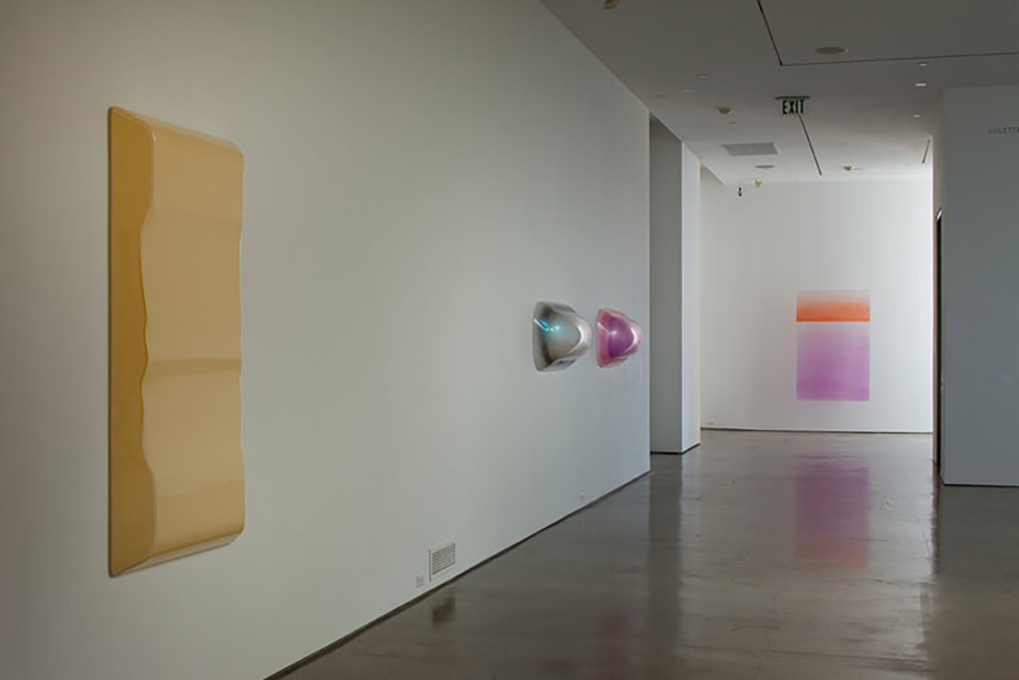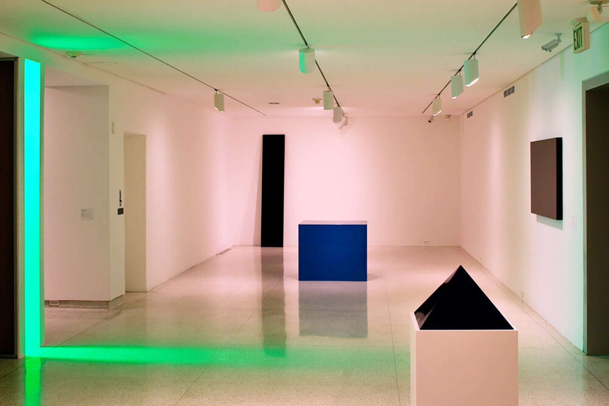 In the 1960s and ‘70s, light became a primary medium for a loosely-affiliated group of artists working in Los Angeles. Whether by directing the flow of natural light, embedding artificial light within objects or architecture, or by playing with light through the use of transparent, translucent or reflective materials, these artists each made the visitor’s experience of light and other sensory phenomena under specific conditions the focus of their work. Key examples of this approach include immersive environments by Bruce Nauman and Eric Orr, each of which produce different and extreme retinal responses; the disorienting and otherworldly glow of a Doug Wheeler light environment; a richly hued and spatially perplexing light piece from James Turrell’s Wedgework series, and the subtle sculpting of space with natural light by Robert Irwin.